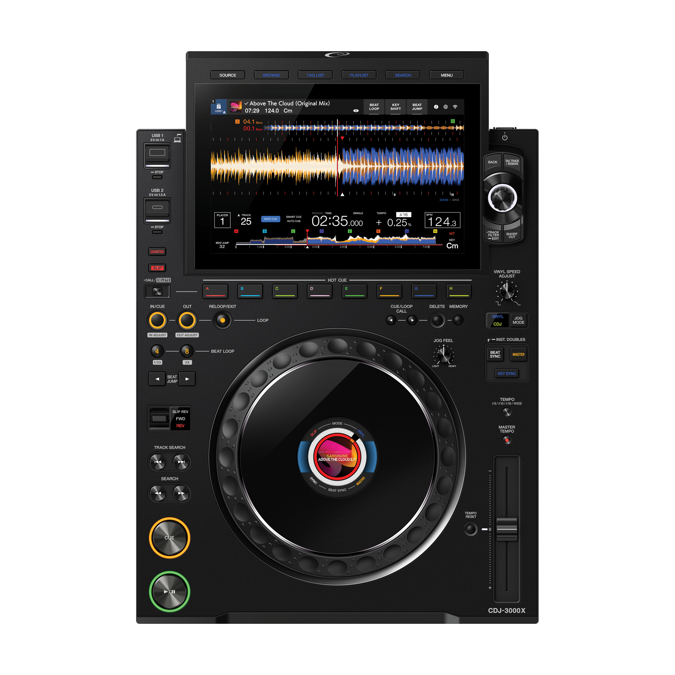 The smooth feel of the CDJ-3000, now with an expanded range. Light for dynamic flow. Heavy for precise, delicate control. Every subtle weight at your fingertips shapes both the moment and its echo. Redesigned from the inside out, the PLAY/CUE buttons deliver new levels of durability – over 500,000 presses each. Every touch is answered with confidence. A lighter, seamless connection brings a world of music to your performance. Speed and smoothness feel effortless. The 10.1-inch glass touchscreen brings up to 16 tracks into vivid view. With striking clarity and a fluid response, your next track is always within reach. Hover your smartphone – running rekordbox for iOS/Android – over the front-facing NFC touchpoint. No login input needed. Instantly connect to streaming and cloud music. The included locking power cable prevents accidental disconnection – keeping your set focused, secure, and powered through every beat.